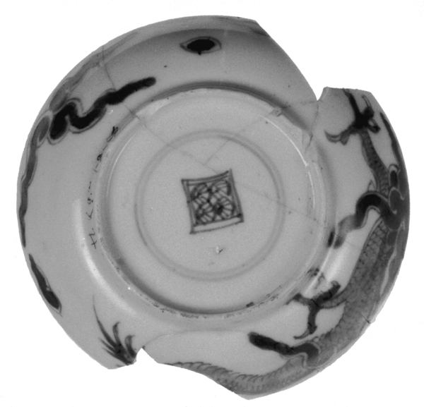 | 5c decoratie | inwendig: onderglazuur blauw: draak jagend op parel, wolken; uitwendig: onderglazuur blauw: gedeelte draak Draekengoet; Kangxi-periode onderglazuur blauw |