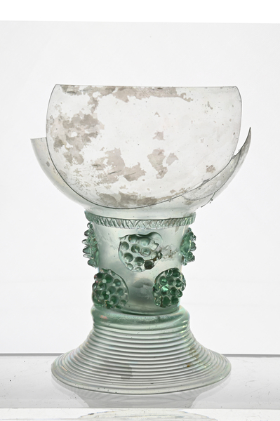 | 4b | roemer met korte brede toegebogen cuppa, geribde draad op de overgang naar de schacht en één of meer verspringende rijen braamnoppen, opgestoken bodem, gewonden draadvoet |