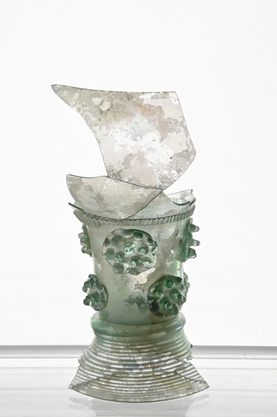 | 4b | roemer met korte brede toegebogen cuppa, geribde draad op de overgang naar de schacht en één of meer verspringende rijen braamnoppen, opgestoken bodem, gewonden draadvoet |