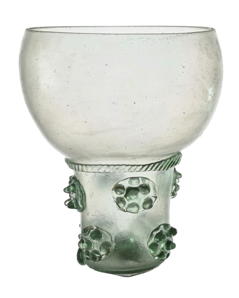 | 4b | roemer met korte brede toegebogen cuppa, geribde draad op de overgang naar de schacht en één of meer verspringende rijen braamnoppen, opgestoken bodem, gewonden draadvoet |
