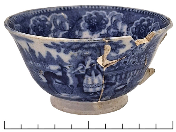 | 5c | blauwe transferprint: binnen- en buitenzijde met meisje in landschap met hert, langs de rand band met rozen |
