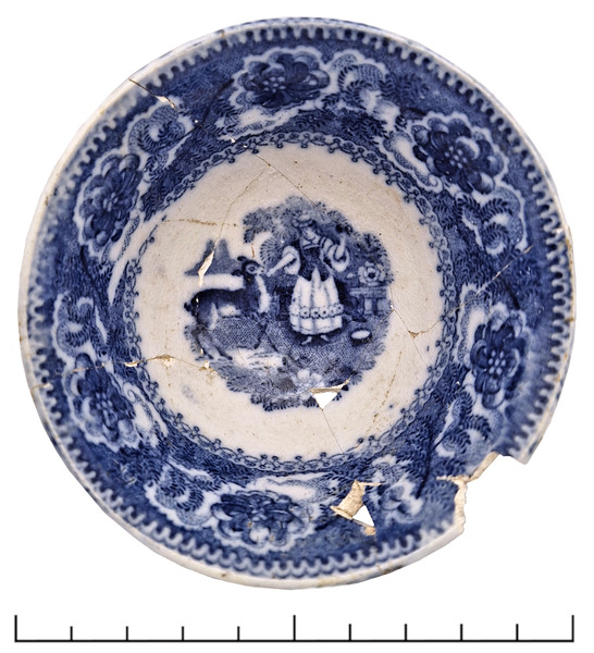 | 5c decoratie | blauwe transferprint: binnen- en buitenzijde met meisje in landschap met hert, langs de rand band met rozen |