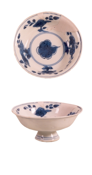 | 5c | beschildering in onderglazuur blauw (kobalt): op bodem bloem binnen cirkel, op binnenwand vier keer bloem |
