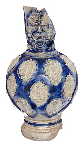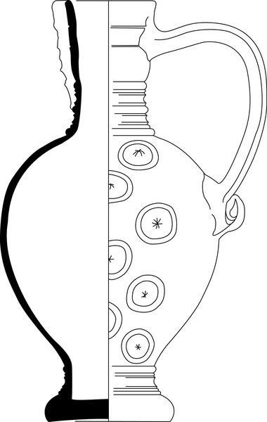 | 4b | rondbuikige kan met hoge nauwe hals met ribbels, met reliëfversiering, hoge standvoet |
