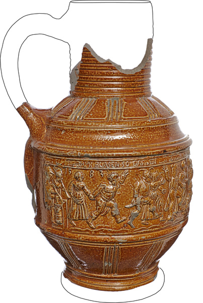 | 5c decoratie | boerendans 1583, tekst: GERET DU MUS DAPR BLASEN SO DANSEN DEI BUREN ALS WEREN SEI RASEN FRI UF SPRICHT BASTOR ICH VER DANS DI KAP [MITTEN KAR] 1583 boerendanskruik |