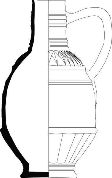 | 4b vorm | hoge kan met door ribbels gemarkeerde zone op buik, hoge cilindrische hals met ribbels, standvoet |