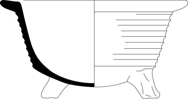 | 4b vorm | kom met scherpe knik bodem-wand en horizontaal geknikte, aan bovenzijde afgeplatte rand, zonder oor of steel, poten |