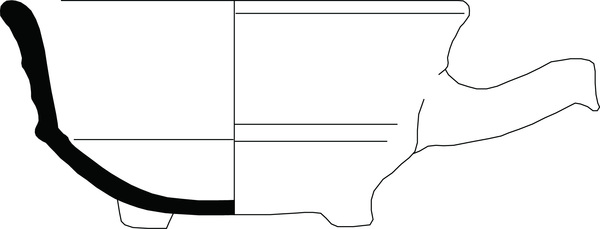 | 4b | vuurtest met ronde bak, scherpe knik bodem-wand, iets uitwijkende wand, poten |