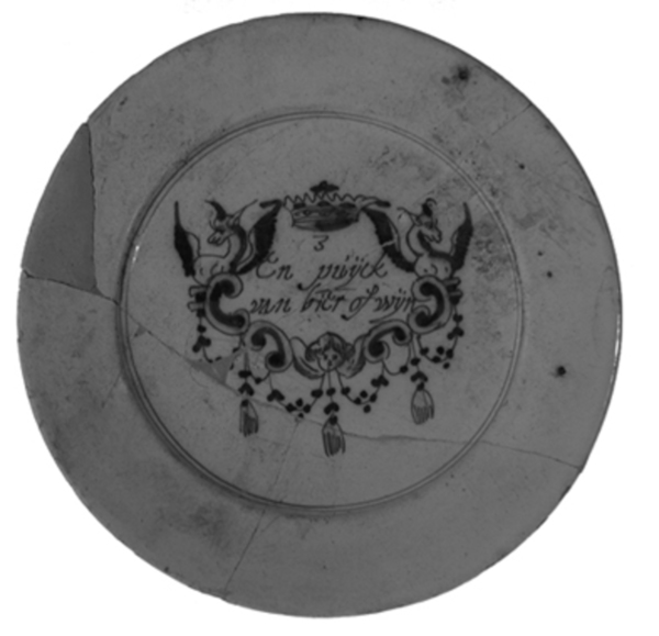 | 5c | tekst: 'een puyck van bier of wijn' tussen grotesken en guirlandes blauw |