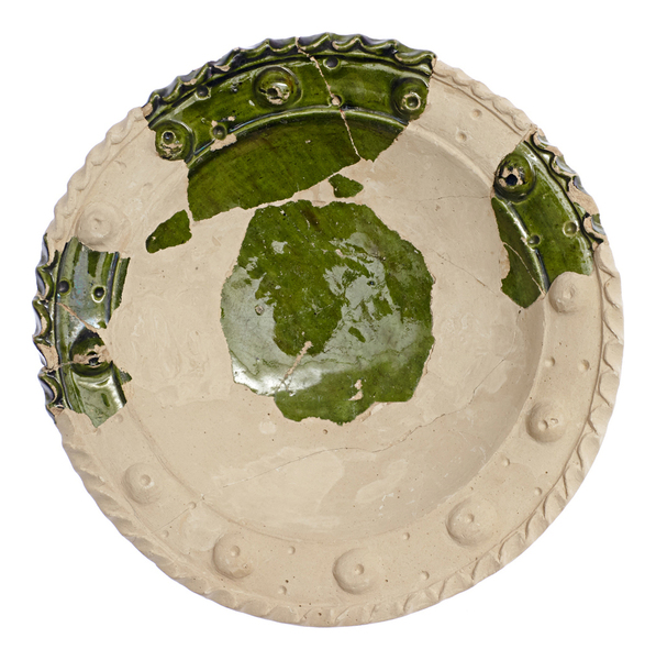 | 4b | diep bord met scherpe knik spiegel-vlag, vlag met deuken en gekartelde rand (naar majolica voorbeeld), standring |
