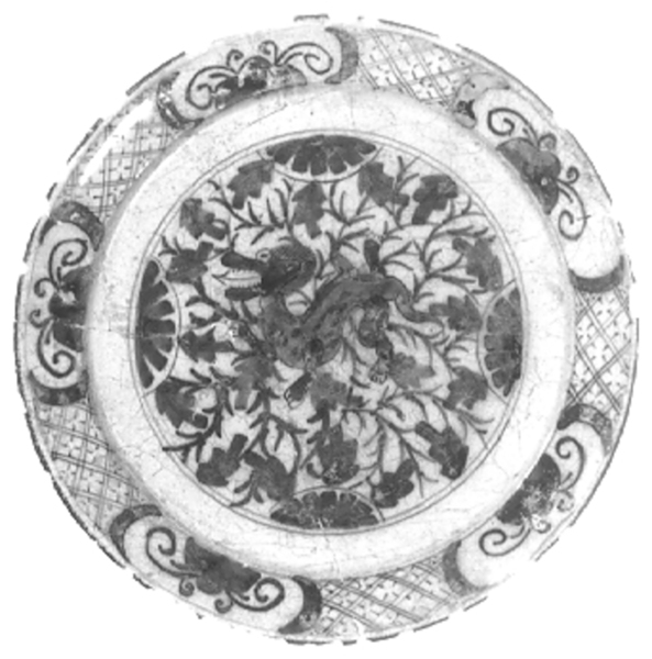 | 5c | inwendig: blauw op wit; vlag: netwerkmotief afgewisseld met ossenkoppen; spiegel: drakendecor binnen bloemranken in cirkel blauw |
