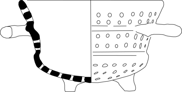 | 4b | vergiet met knik bodem-wand, afgeronde bodem en rechte rand, poten |