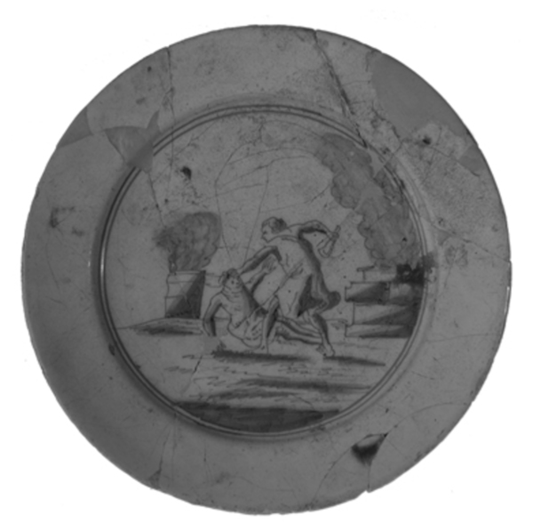 | 5c decoratie | inwendig: bijbelscene: Kain doodt Abel met een ezelskinnebak blauw |