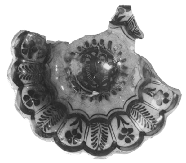 | 5c decoratie | inwendig: spiegel: bloem; vlag: gestileerde bloemen en takken blauw |