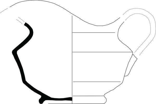 | 4b | bolle, in mal gevormde, gefacetteerde kan met ribbel op halsaanzet en uitgebogen hals en rand, oor recht tegenover brede schenklip, zware standring |