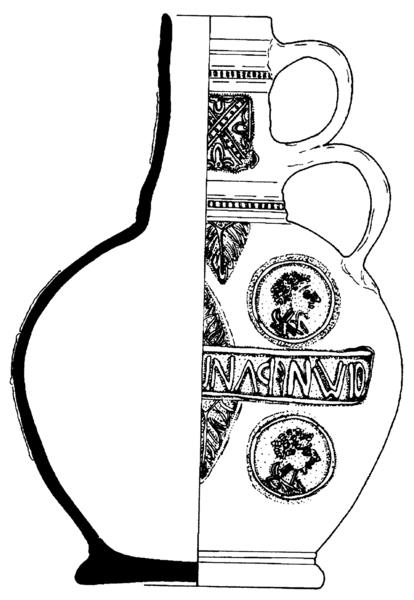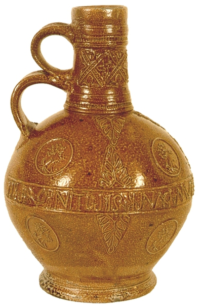 | 5c decoratie | appliques: op buik: tekstband (spiegel-beeldig): 'ofwn danck si got in ewickeit', acantusbladeren en portretbustes; op hals: drie ornamentale appliques en radstempel |