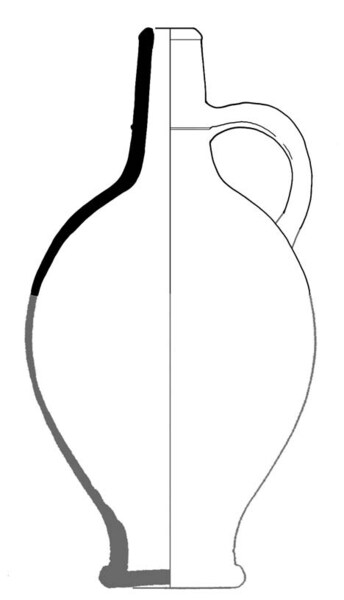 | 4b vorm | P-kruik: bolle fles, hoge hals met ronde lip en ribbel op hals, smalle standvoet |