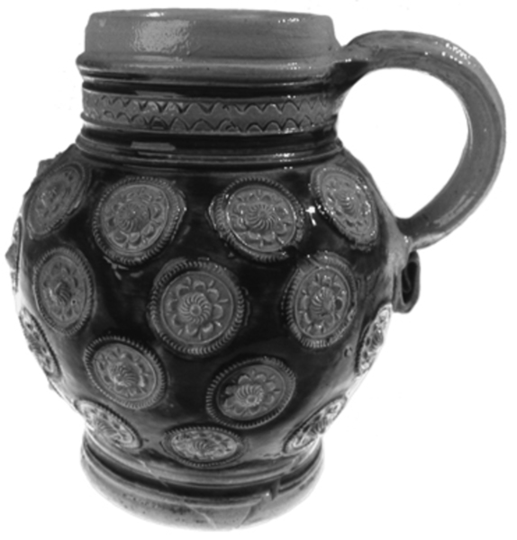 | 5c | uitwendig: ronde medaillons met 'boterbloem', stempelversiering uitwendig: blauw krul bij ooraanzet |