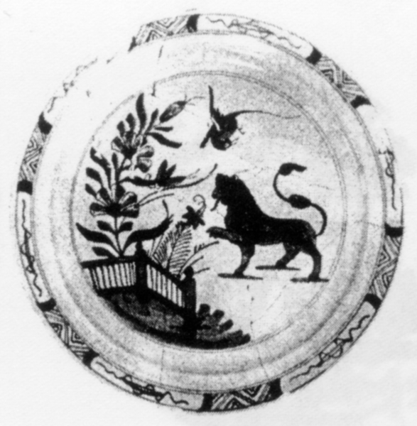 | 5c decoratie | inwendig: blauw op wit; vlag: vakverdeling met geometrische motieven; spiegel: leeuw in Chinese tuin met overvliegende fazant blauw |