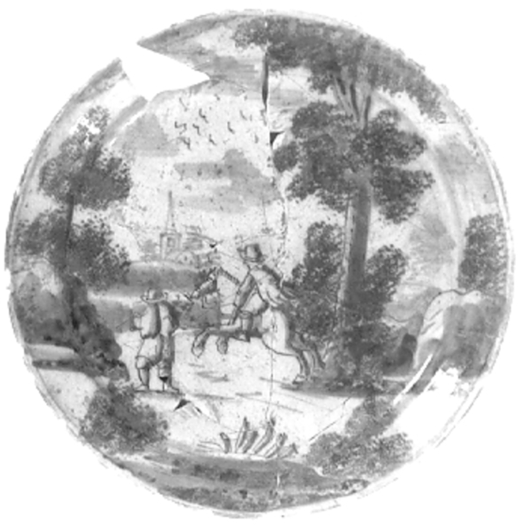 | 5c | inwendig: blauw op wit: ruiter te paard in landschap met kerk en een man op de rug gezien blauw |