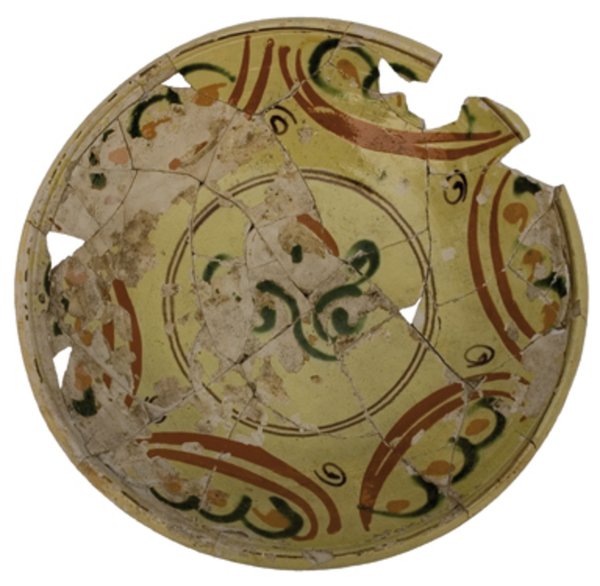 | 5c | vlag en spiegel: ornamentaal in rood, bruin en groen inwendig slibversiering: rood, groen |