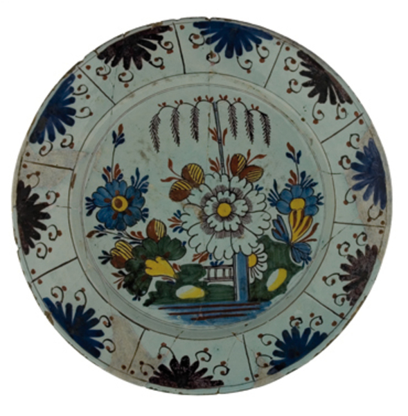 | 5c | vlag: tien panelen met gestyleerde bloemen in afwisselend paars/rode en blauw/rode uitvoering, spiegel: tuin met boom en bloemen in polychrome uitvoering inwendig: polychroom |