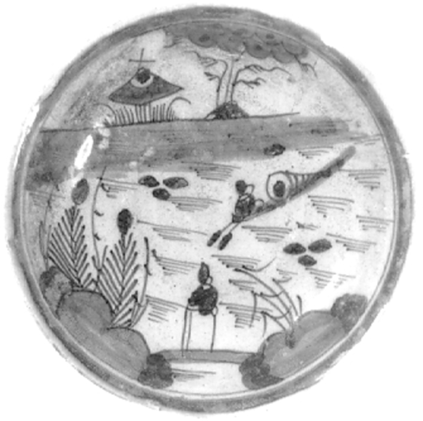 | 5c decoratie | inwendig: blauw op wit; Chinees landschap blauw |