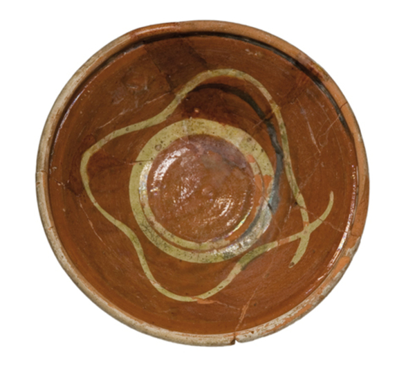 | 5c decoratie | rand: ongeglazuurd wit, vlag: slordige golflijn, spiegel: dubbele cirkel inwendig slib |