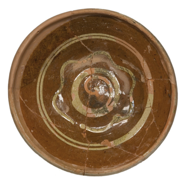 | 5c decoratie | rand: ongeglazuurd wit, vlag: dubbele, concentrische cirkel met daaronder een golflijn rand: ongeglazuurd wit, vlag: cirkel, spiegel: spiraalvormig opgezette cirkel, slordige golflijn inwendig slib |