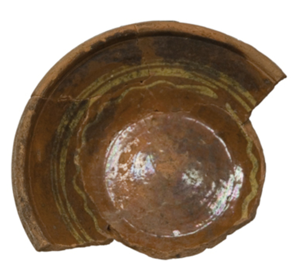 | 5c decoratie | rand: ongeglazuurd wit, vlag: dubbele, concentrische cirkel met daaronder een golflijn inwendig slib |