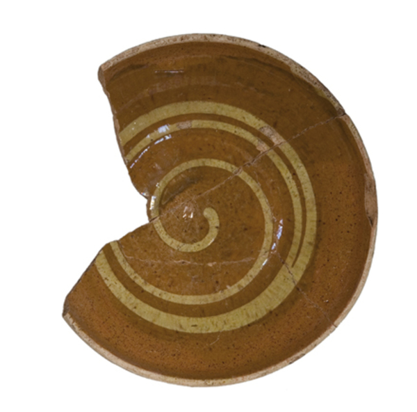 | 5c decoratie | rand: ongeglazuurd wit, spiegel: spiraalvormig opgezette cirkel inwendig slib |