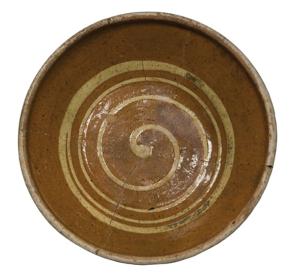 | 5c decoratie | rand: ongeglazuurd wit, spiegel: spiraalvormig opgezette cirkel inwendig slib |