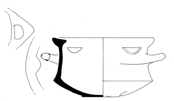 | 4b | komfoor met scherpe knik bodem-wand, naar buiten geknikte rand, uitgesneden luchtgaten en 'poten' op rand, poten |