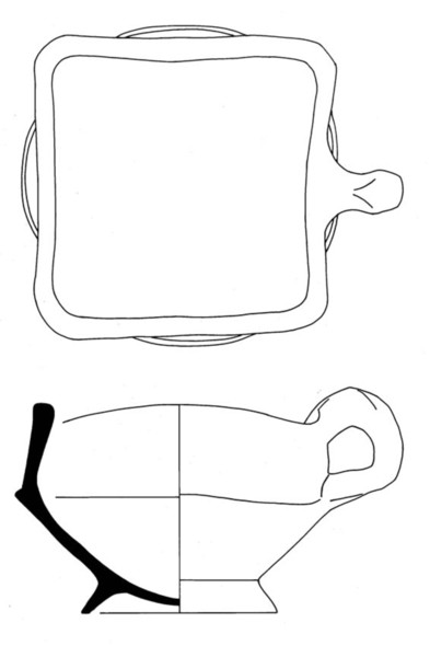 | 4b | vierkante vuurtest met scherpe knik bodem-wand en afgeronde (verdikte) rand, standring |