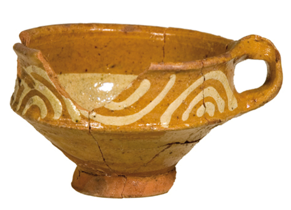 | 5c decoratie | inwendig: gele slib, uitw: ringeloor versiering op schouder inw: gele slib |