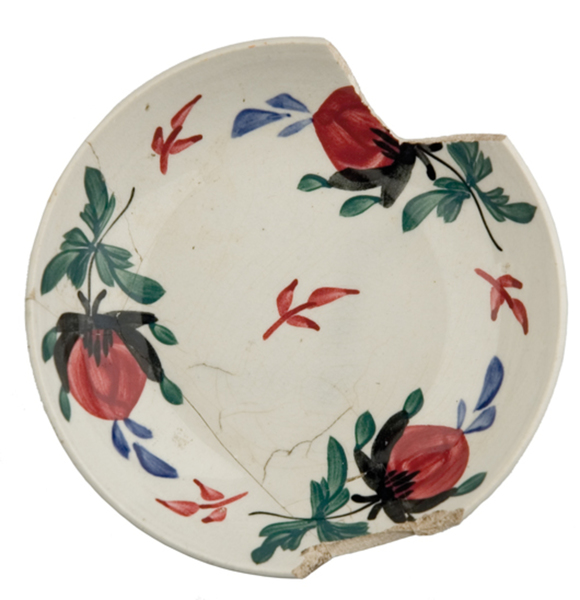 | 5c decoratie | inwendig: floraal motief bestaande uit zwarte stengel, zwarte kelkbladen met groene uiteinden, groene bladeren, een bordeaux rode bloem met blauwe meeldraden, driemaal afgewisseld door een rood drieblad; op spiegel rood drieblad inwendig: rood |
