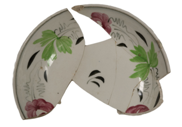 | 5c | inwendig: onder rand zwart filet, drie groepen van een groen blad, zwarte krullerige takken en bordeaux rode bloenm, her en der zijn zwarte blaadjes geschilderd (drieblad), op spiegel zwart drieblad inwendig: rood |