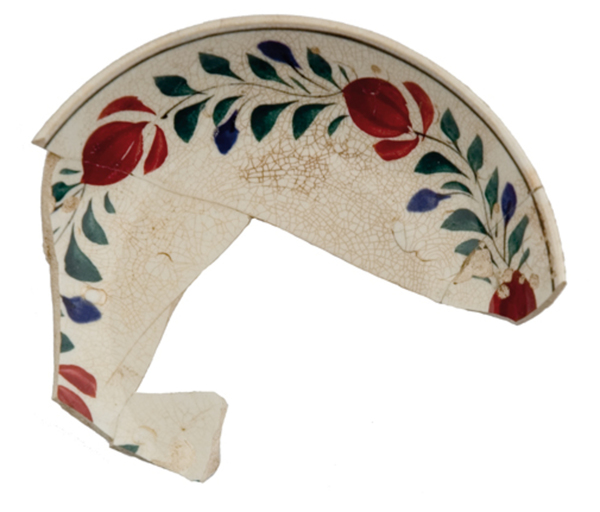 | 5c | inwendig, onder rand zwart filet, zes doorlopende groepen van bordeaux rode bloem, blauwe en groene blaadjes inwendig: polychroom |