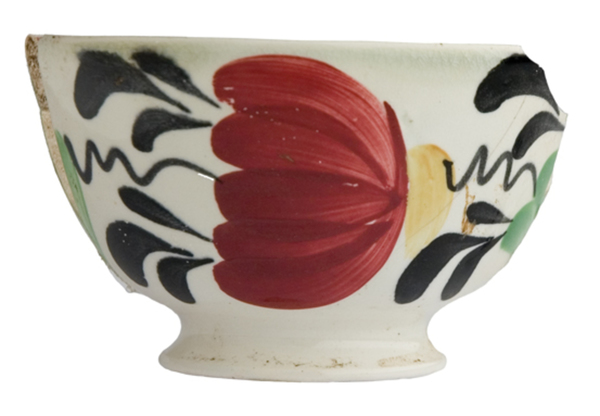 | 5c decoratie | inwendig: onder rand rood filet, uitwendig: twee groepen van bordeaux rode bloem met geel hart gevolgd door zwarte blaadjes rondom een krultak, brede groene blaadjes en weer zwarte blaadjes inwendig: rood, uitwendig: polychroom |