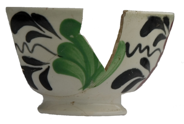 | 5c | inwendig: onder rand rood filet, uitwendig: twee groepen van bordeaux rode bloem met geel hart gevolgd door zwarte blaadjes rondom een krultak, brede groene blaadjes en weer zwarte blaadjes inwendig: rood, uitwendig: polychroom |
