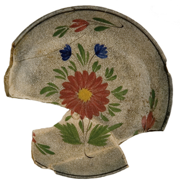 | 5c | inwendig: onder rand zwart filet, daar onder vier liggende rode boemen met zwarte stengel en groene blaadjes, op spiegel grote rode bloem met geel (bovenglazuur) hart om geven door groen blad en twee blauwe bloemetjes met zwarte stengel inwendig: rood |