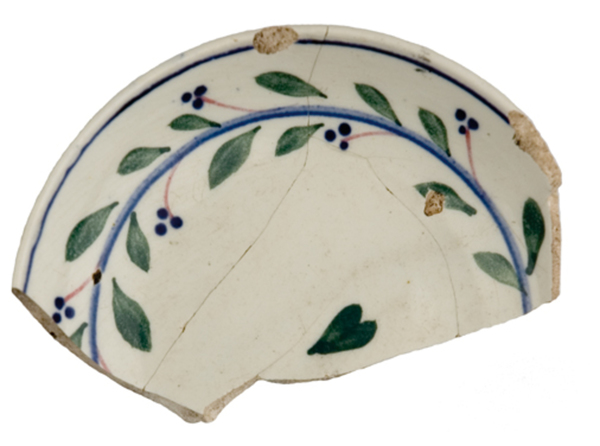 | 5c | inwendig: onder rand blauw filet, op overgang vlag/ spiegel blauwe lijn met aan weerszijden gebladerte met kleine rode takjes waaraan drie blauwe besjes (drievijfblad), spiegel groen tweeblad inwendig: rood |