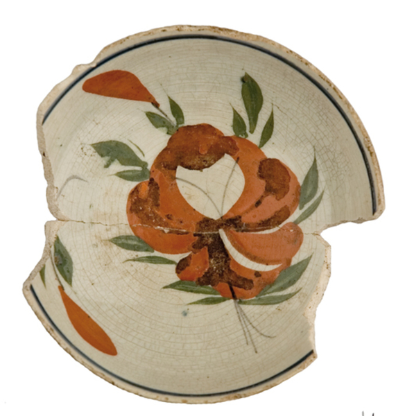 | 5c decoratie | inwendig: onder rand blauw filet, op spiegel grote oranje bloem met groene bladeren inwendig: rood |