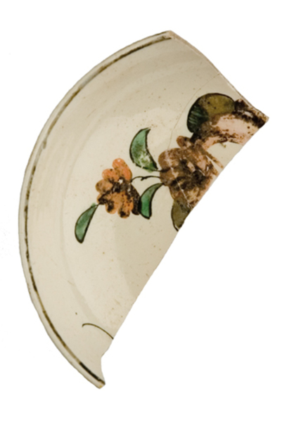 | 5c | inwendig: onder rand zwart filet, op spiegel grote oranje bloem met groen blad en bloemknop inwendig: rood |