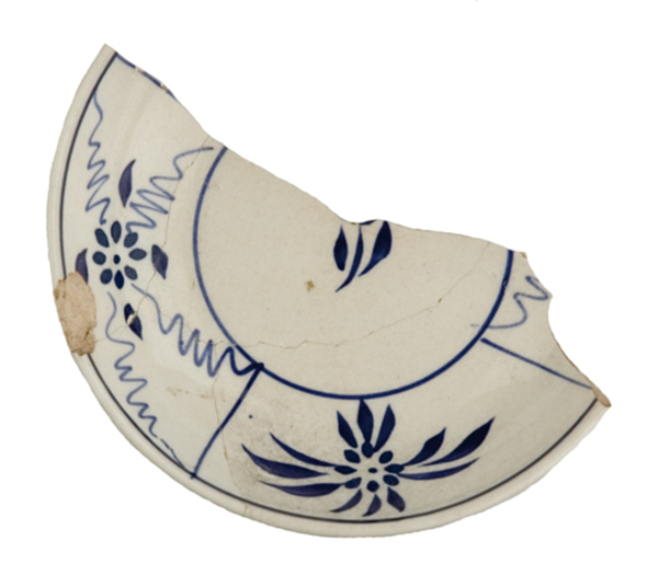 | 5c | inwendig: onder rand en om spiegel filet, de versiering daartussen is opgedeeld in vier vakken met zeer stylistische bloemen, op spiegel een bloementak inwendig: blauw |