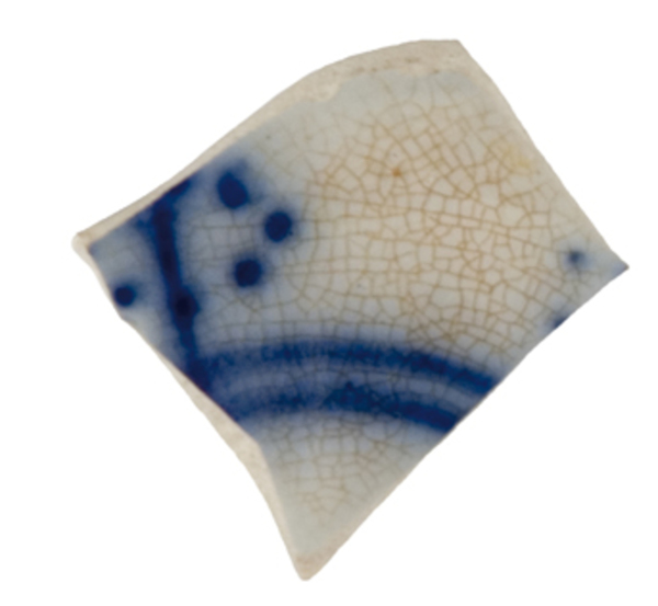 | 5c decoratie | in vloeiblauw, inwendig: tussen filet onder rand en dubbel filet rond spiegel zijn zes bogen die versierd zijn met ovalen van acht stippen, op spiegel ovaal van acht stippen |