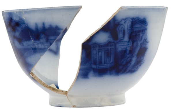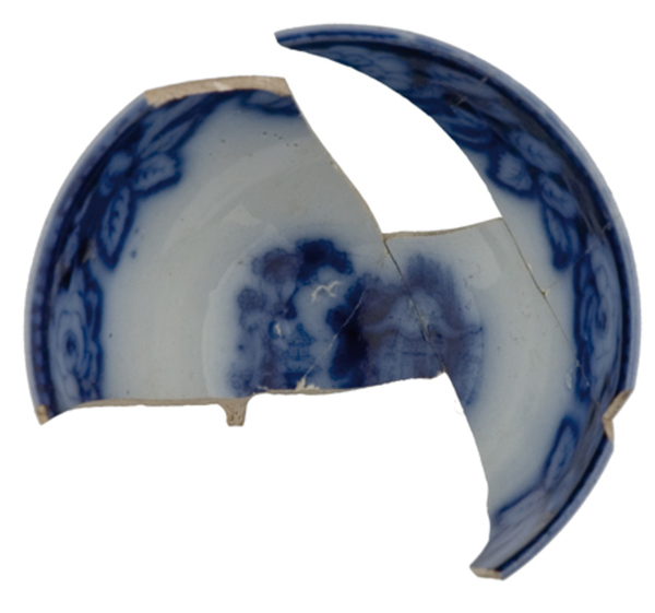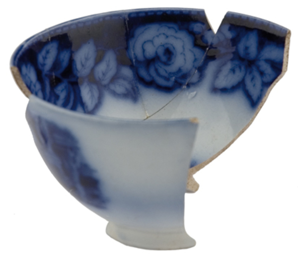 | 5c | in vloeiblauw, inwendig: onder rand en op bodem bloemendecor, uitwendig: tweemaal een huis met erker blauw |