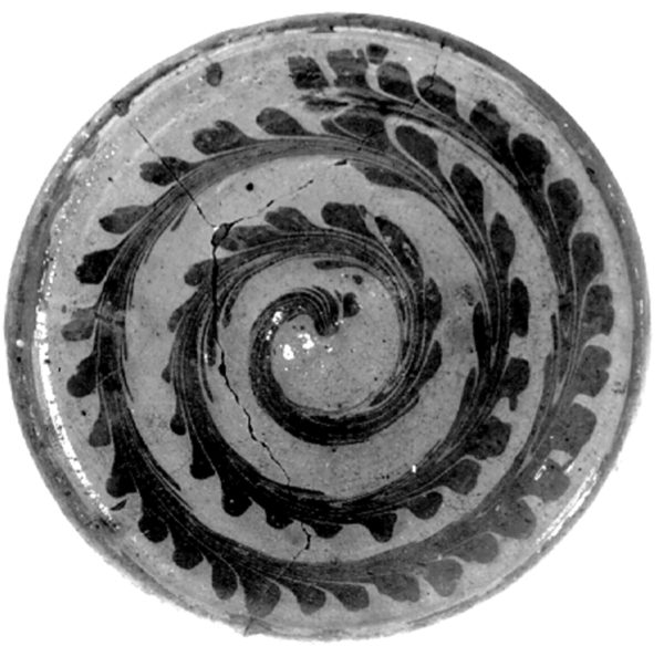 | 5c decoratie | inwendig: spiraal van slibwerk, bruin op geel |