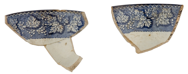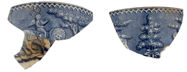 | 5c | inwendig: versiering van druivenranken op raster ondergrond, uitwendig: onder rand boogjes daaronder aan een kant twee putti in tuin, waarvan één op een leeuw zit, de andere zijde ontbreekt blauw |