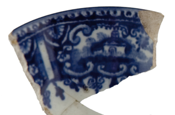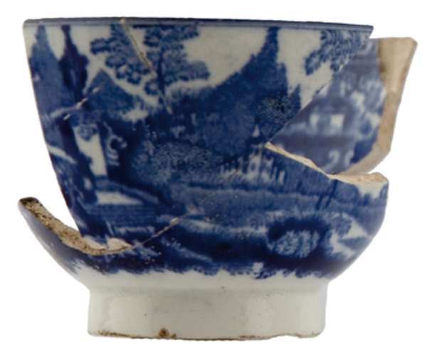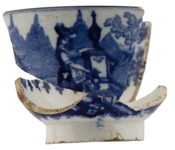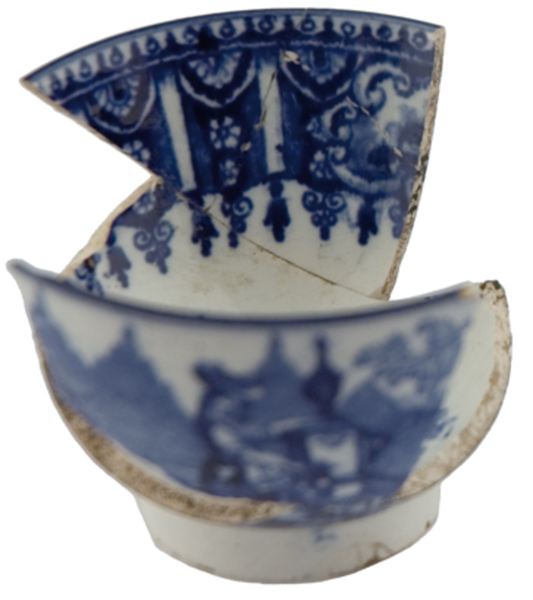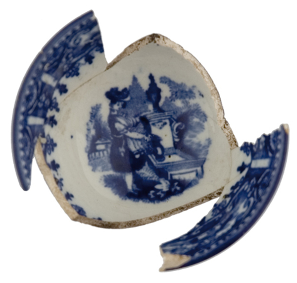 | 5c | inwendig: brede versiering met panorama's, op bodem dame met kan aan pomp, uitwendig: tweemaal een afbeelding met o.a. vrouw met kan aan pomp blauw |